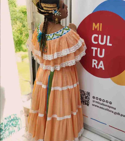 Pollera completa camisa, falda, 1 enagua, joyero de plata bañado en oro de cabeza y pecho.